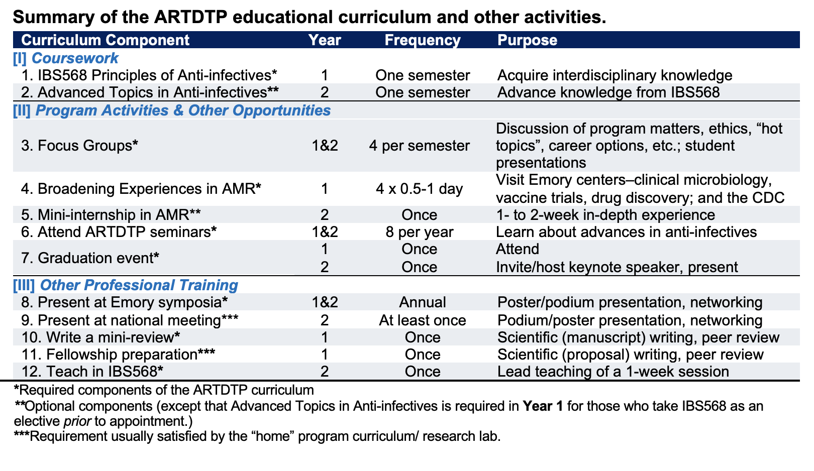 The goal of the ARTDTP educational curriculum is to complement on-going research training with broad interdisciplinary knowledge and skills related to AMR, as well as career and professional support to enable trainee progression into the scientific workforce in this area. The training curriculum and other training opportunities have been designed to broaden exposure in areas such as clinical microbiology, clinical trials, environmental surveillance, and drug discovery, as well as other initiatives (e.g., “mini-internships”) designed to further broaden and enhance training relevant to AMR and therapeutic development. The formal two-year curriculum consists of a required course (IBS568), teaching and professional development activities, and participation in all ARTDTP-specific events; these components are summarized in the Table below.