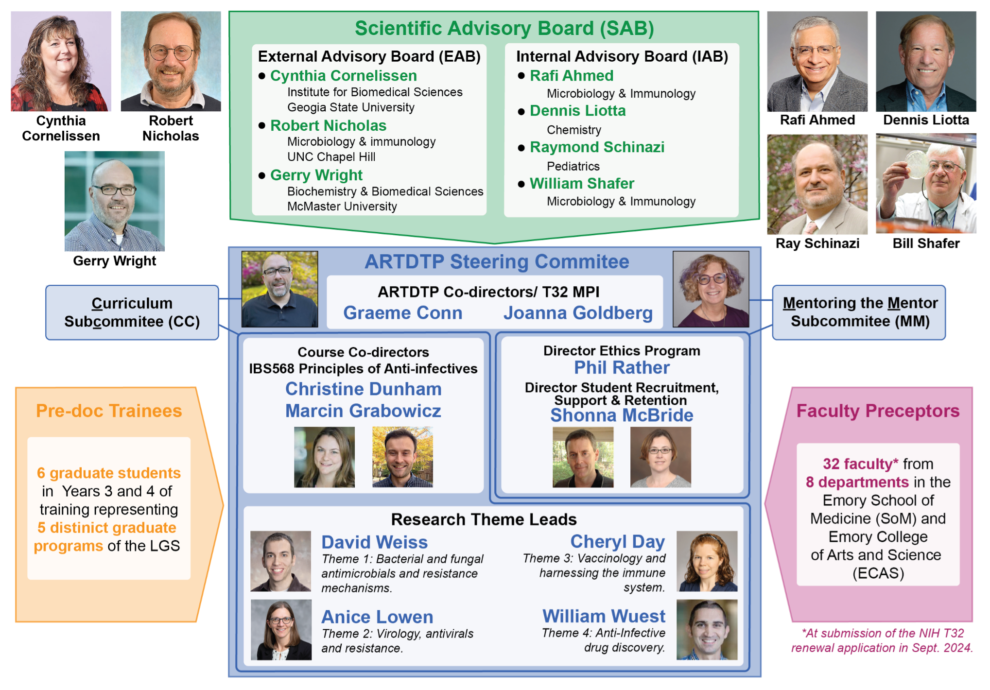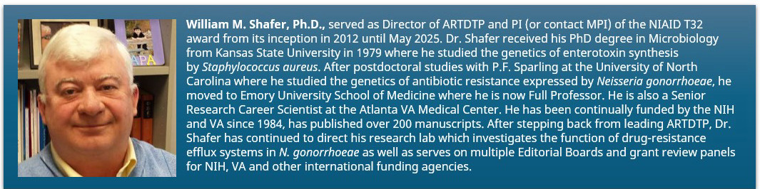 Funding for ARTDTP from the National Institute for Allergy and Infectious Diseases (NIAID) was secured by Dr. Shafer with the award of an NIH T32 in 2014 (2014-2019) which was subsequently renewed (2020-2025). In 2022, Dr. Shafer was joined as ARTDTP Co-director and T32 MPI by Dr. Graeme Conn (Emory, Biochemistry) as part of a planned leadership transition ahead of the next NIH T32 renewal in 2024. For this renewal application–awarded in August 2025 (2025-2030), Dr. Conn was joined as MPI by Dr. Joanna Goldberg (Emory, Pediatrics) with Dr. Shafer moving to a new role on the Program’s Scientific Advisory Board (SAB).